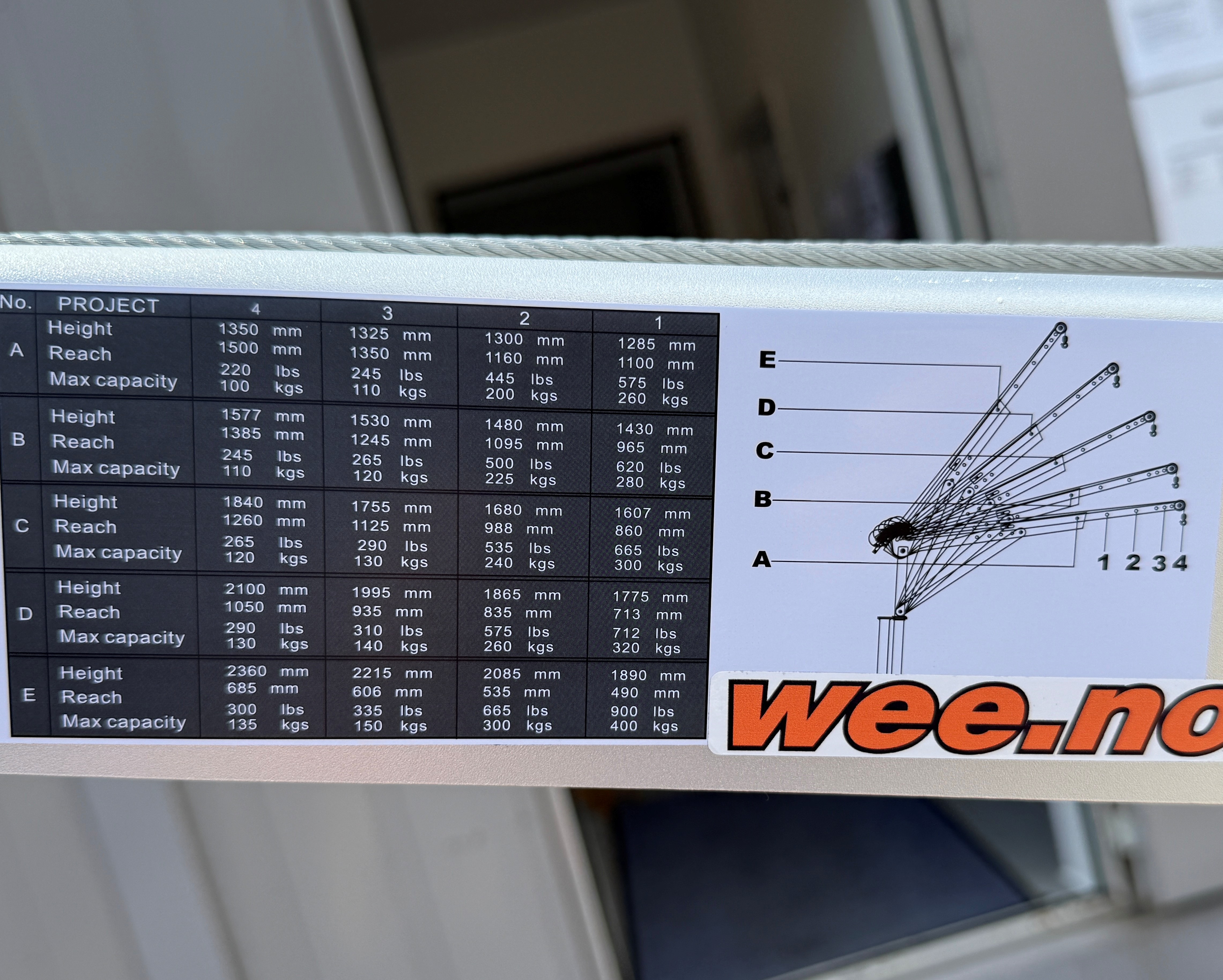 Oversikt over hvordan løftekapasiteten endres avhengig av armens posisjon og rekkevidde finner du under fanen Produktdokumentasjon. Jo lenger ut armen er justert, desto lavere blir løftekapasiteten - og omvendt, jo kortere rekkevidde, desto høyere løfteevne. Kranen kan justeres trinnvis slik at du finner den ideelle kombinasjonen av høyde, rekkevidde og kapasitet til oppgaven.