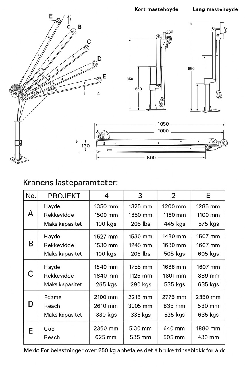 Kapasitet: 400 kg løftekapasitet, maks 100 kg flat bom 150 cm